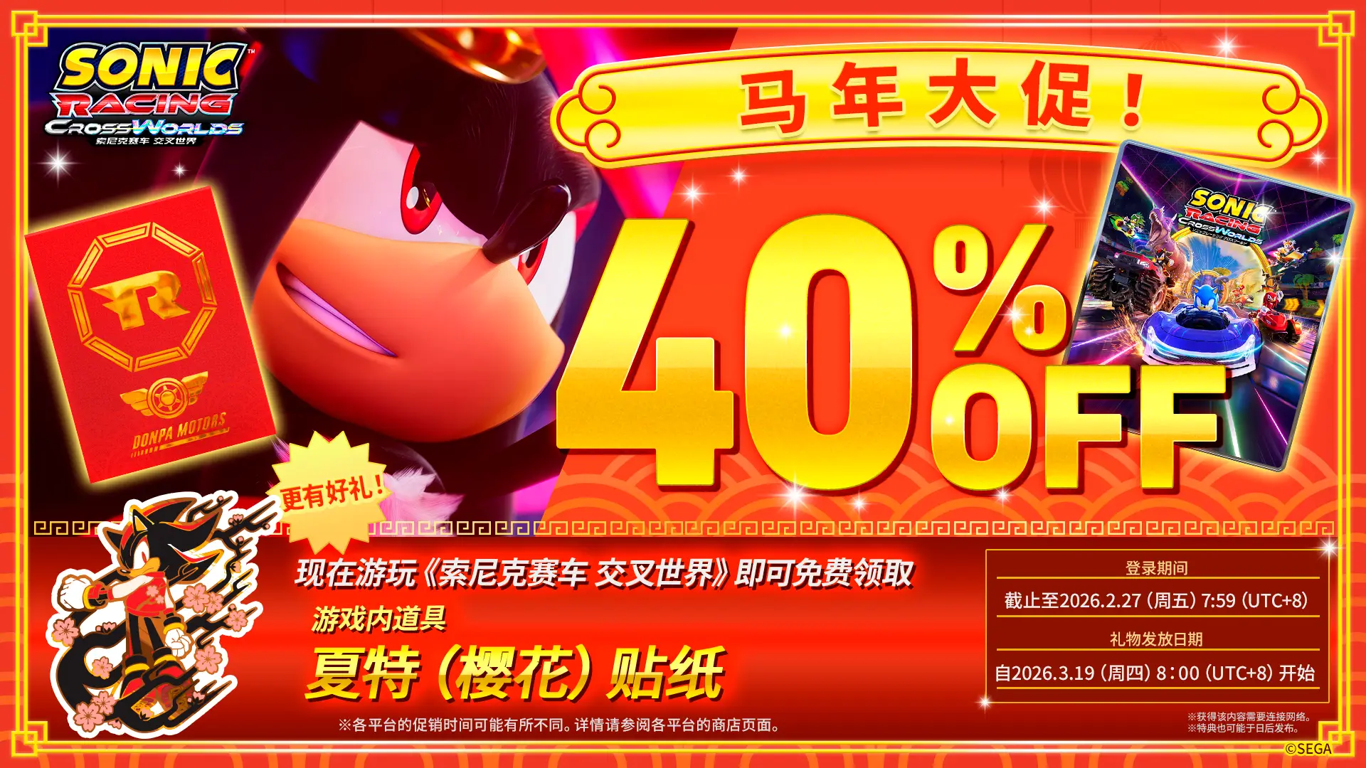 2026年2月13日至2月27日期间,所有游玩《索尼克赛车 交叉世界》的玩家都将获赠“SONIC ART”贴纸!