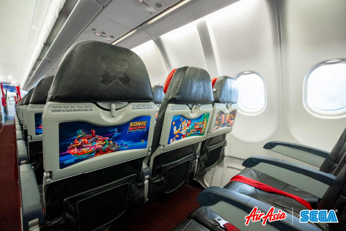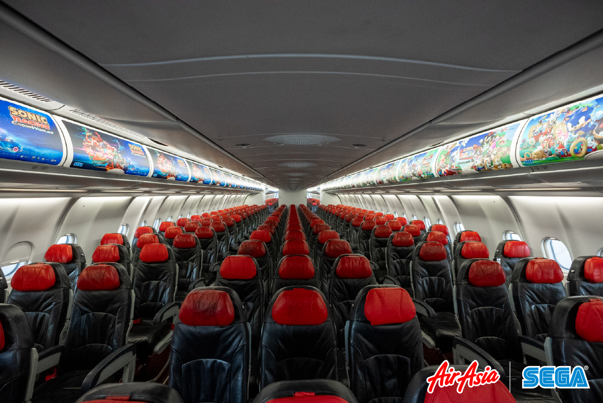 The cabin of AirAsia X's (flight code: D7) Airbus A330 aircraft has been redesigned with Sonic Racing: CrossWorlds and Sonic Rumble decorations!