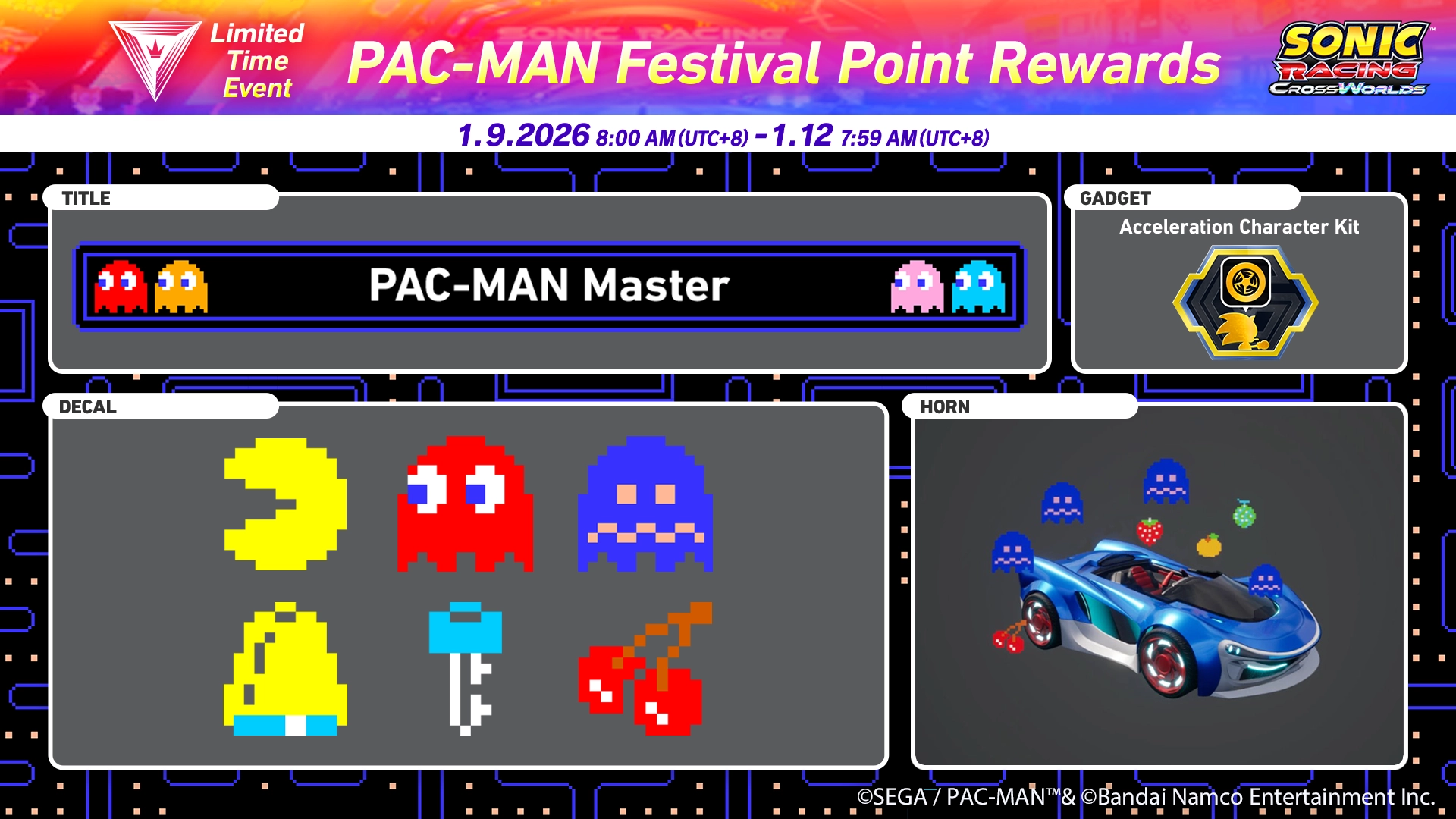 PAC-MAN, Blinky, Inky, Pinky, and Clyde hit the racetrack in Sonic Racing: CrossWorlds!