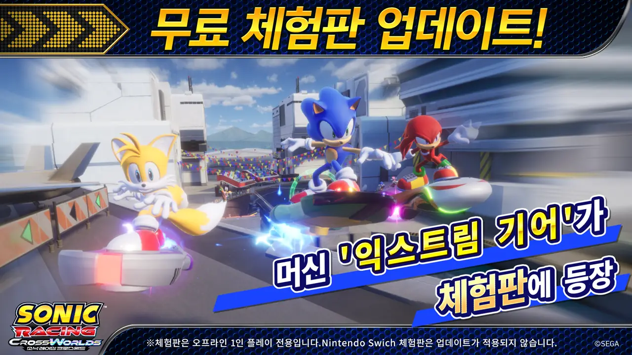 『소닉 레이싱 크로스월드』 체험판에서는 '그랑프리 모드'와 '타임 트라이얼 모드'를 플레이하실 수 있습니다! 불꽃 튀는 레이스를 꼭 체험해 보세요.