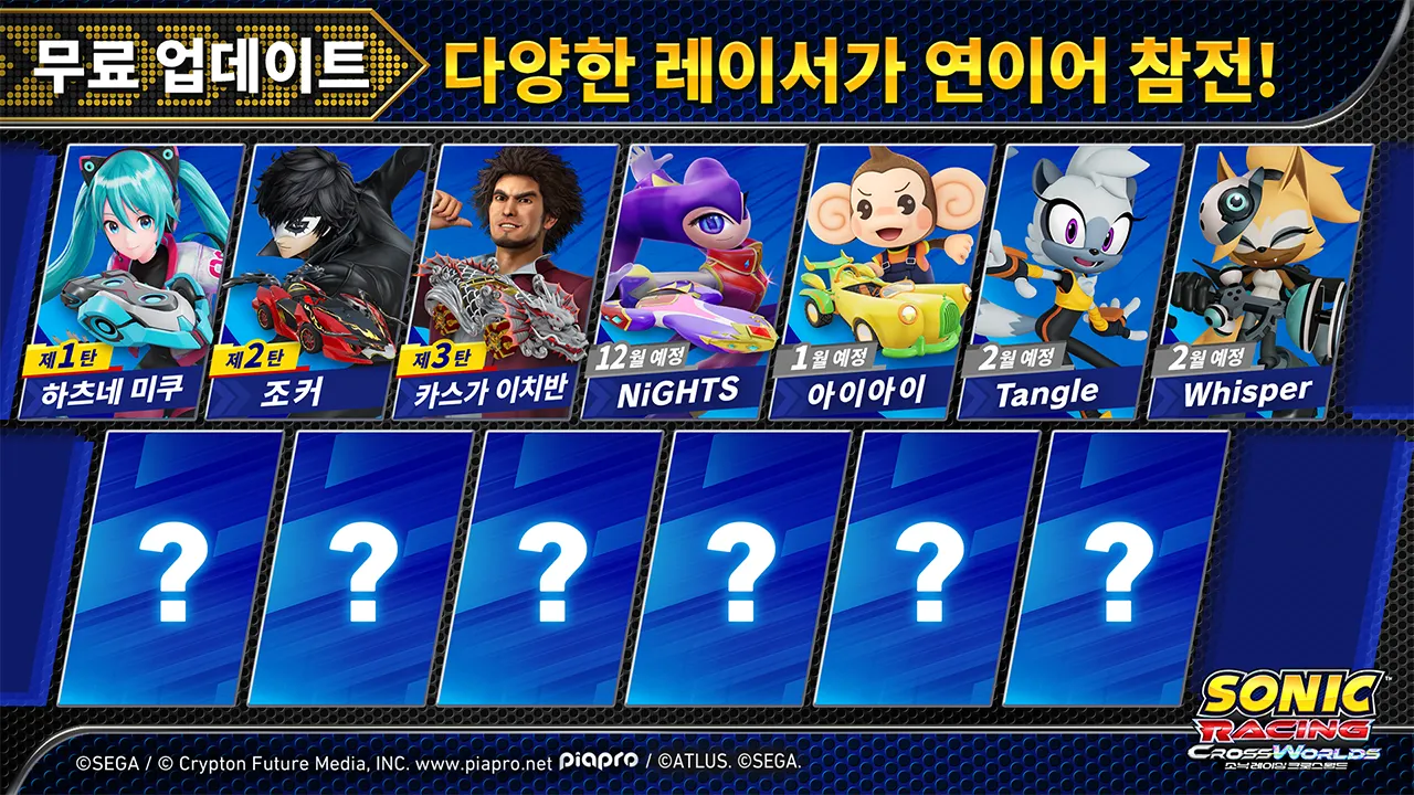 'NiGHTS', '아이아이', 'Tangle', 'Whisper'가 레이서로 등장하고, 'NiGHTS', '몽키볼' 시리즈의 특징이 담긴 특별한 머신도 추가!