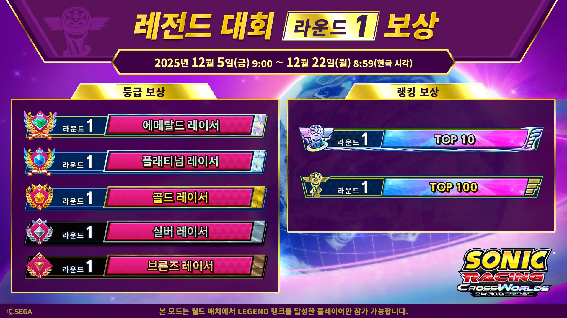 레전드 대회는 정상급 레이서를 대상으로 한 기간 한정 온라인 모드이며, Ver.1.2.0부터 개최됩니다. 기간 중에 레이팅을 올려 세계 정상인 '에메랄드 등급'을 노려 보세요.