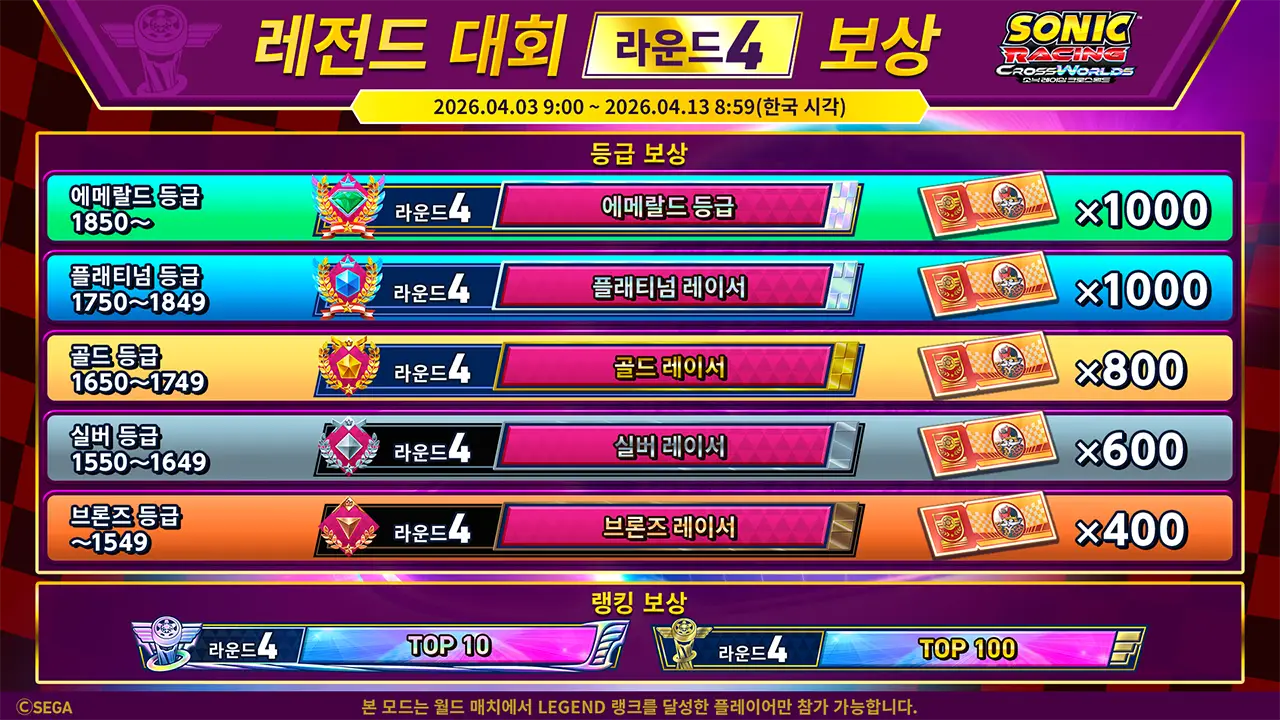 라운드 3 종료 시점의 등급에 따라 이번 레전드 대회 개최 시의 등급이 결정됩니다.