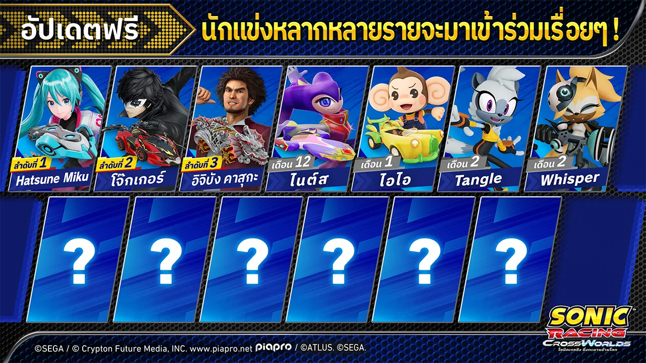 ไนต์ส, ไอไอ, Tangle, Whisper จะมาปรากฏตัวในฐานะนักแข่ง พร้อมทั้งเพิ่มรถสุดพิเศษที่นำจุดโดดเด่นของซีรีส์ไนต์ส และ Monkey Ball กลับมา!