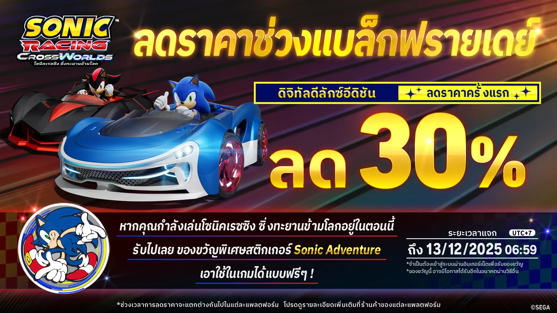 ผู้ใช้ทุกคนที่เข้าเล่นเกมโซนิคเรซซิง ซิ่งทะยานข้ามโลก ตั้งแต่วันที่ 21 พฤศจิกายน - 13 ธันวาคม 2025 รับสติกเกอร์ Sonic Adventure เป็นของขวัญไปเลย!