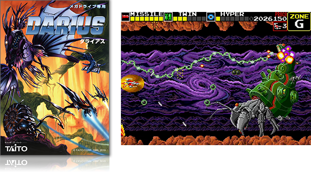 첫 번째 타이틀은 타이토사 인기 아케이드 타이틀 ‘다리우스’. 1986년에 등장한 아케이드 게임을 Mega Drive Mini 특유의 고차원 이식으로 실현하였다. 아케이드판을 상회하는 총 26명의 보스가 등장하는 등, Mega Drive Mini판에서만 실현할 수 있었던 추가 요소도 기대하길 바란다.
