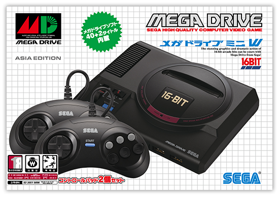 '메가 드라이브 미니 (Mega Drive Mini)'에는 조작성을 높게 평가받았던 컨트롤러 '파이팅 패드 6B'를 2개 동봉. 또한 패키지 디자인은 1990년 이후의 후기판 디자인을 바탕으로 하여 당시의 분위기를 패키지로도 즐길 수 있습니다.
