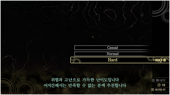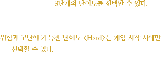 본 작품에서는 3단계의 난이도를 선택할 수 있다. 손쉽게 즐길 수 있는 <Casual>과 몰입감을 느낄 수 있는 <Normal>은 게임 중 언제든지 변경할 수 있다. 위험과 고난에 가득찬 난이도 <Hard>는 게임 시작 시에만 선택할 수 있다. 플레이 중 Casual이나 Nomal로는 변경할 수 있으나 두 번 다시 Hard로는 돌아갈 수 없다. 자신에게 맞는 난이도로 플레이하자.