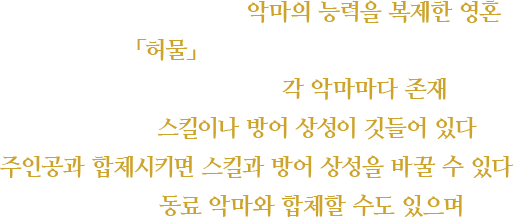 종종 발견되는 돌이 된 거대 악마. 십수년 전에 일어난 대규모 전쟁의 흔적이라고 한다. 석상을 만지면 동료 악마의 레벨이 오른다.