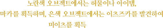 노란색 오브젝트에서는 허물이나 아이템, 마카를 획득하며, 은색 오브젝트에서는 이츠즈카를 발견하여 미이츠를 획득할 수 있다. 이들 모두 모험에 도움을 주는 것이므로 한번 찾아보자.