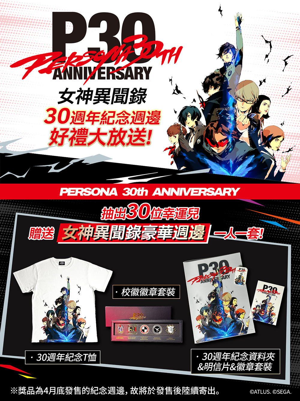為紀念女神異聞錄30週年,現正舉辦抽出30名幸運兒贈送豪華紀念週邊套組的抽獎活動。 請不要錯過本次機會。 ・參加方法:請至官方SNS查看 ・活動期間:3月23日~3月31日 ※中獎名單將於4月上旬公布。