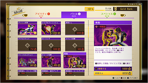 강적과의 배틀에서는, 차지 공격이나, 타이밍 입력으로 위력이 상승하는 공격 등, 강력한 기술을 구사할 수 있는 일섬을 얼마나 잘 사용하는지가 공략의 관건이 된다.
