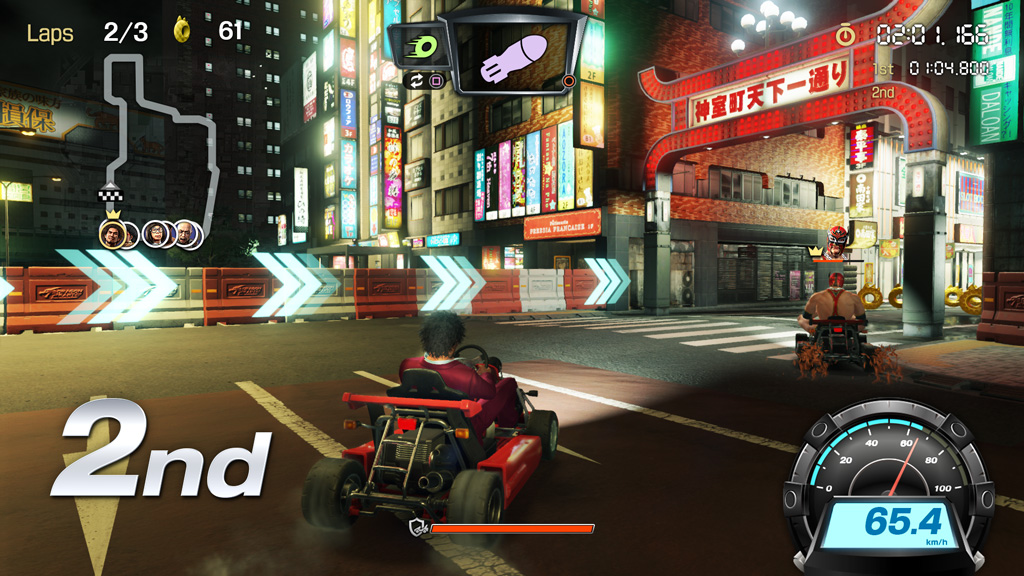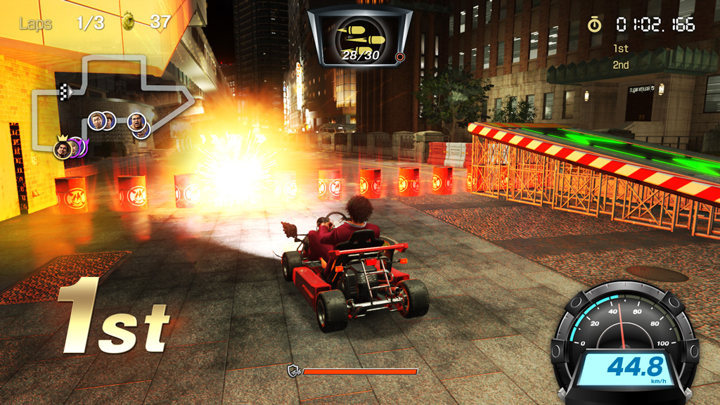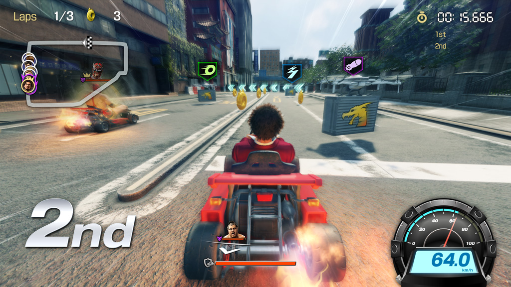 차이나타운을 배경으로 카트를 드리프트하여 코너링. 테크닉을 연마해 라이벌을 압도하라!