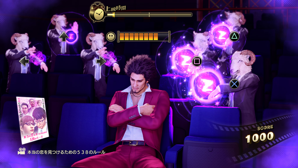 「명화 극장」은 액션부터 다큐멘터리까지 다양한 장르의 영화를 즐길 수 있는 스팟입니다. 단, 영화 상영 중에는 끊임없이 「수마」들이 습격해와 카스가를 재우려고 합니다. 그러한 수마들을, 표시되는 버튼을 재빨리 눌러 격퇴하십시오.