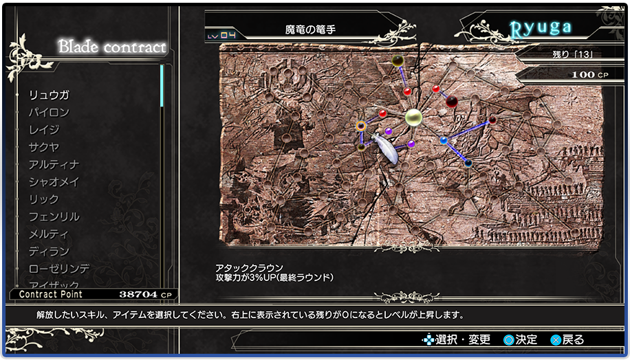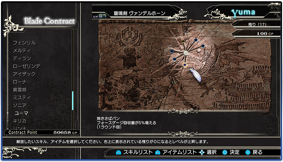 전투에서 얻은 CP(Contract Point)를 「계약의 판」에 주입하여 새로운 스킬을 손에 넣자! 캐릭터 선택 화면에서 설정하면 스킬 효과가 발휘된다!
