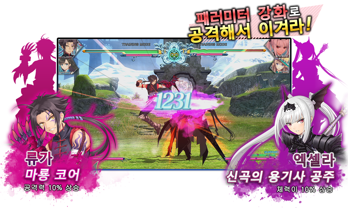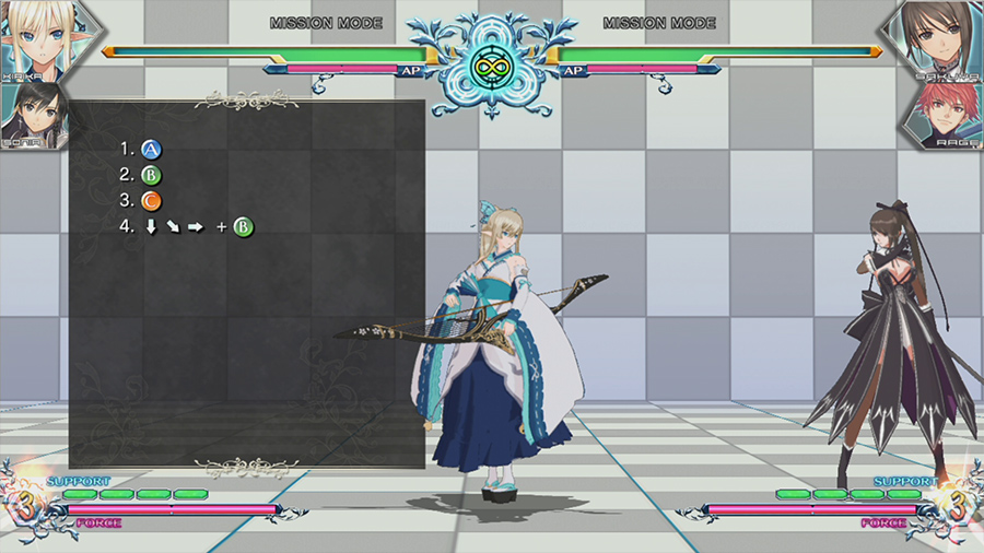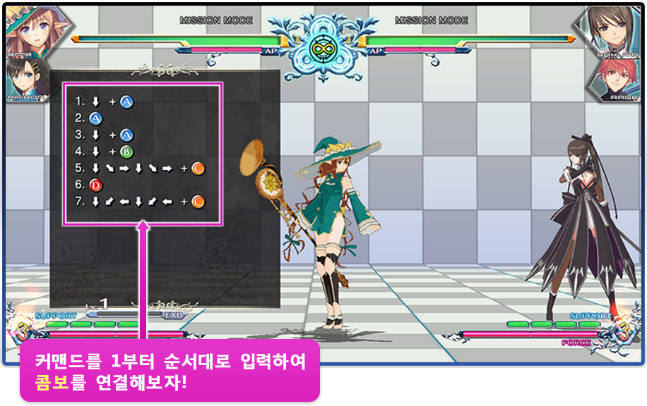 통상공격에서 포스 액션으로 연결하거나 잡기에서 전개되는 콤보와 서포트 캐릭터와의 연계를 의식한 콤보 등, 각 캐릭터의 기본 콤보부터 응용까지 익힐 수 있습니다.