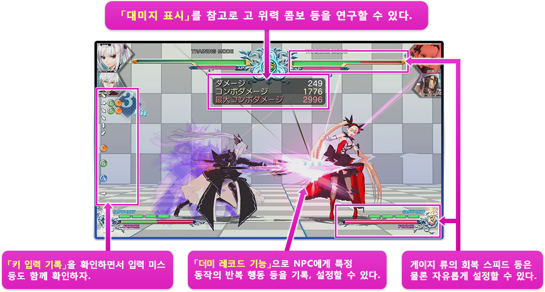 대미지 정보와 입력 기록을 확인하면서 기본적인 커맨드 연습을 하거나 대전 상대의 반응을 설정하여 실전과 같은 연습을 하는 등, 다양한 트레이닝을 할 수 있는 모드입니다.