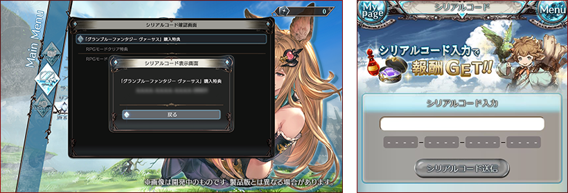 - 본 특전에 포함된 '그랑블루 판타지'에서 사용할 수 있는 일부 시리얼 코드는 '그랑블루 판타지 버서스'에서 특정 조건을 만족하면 발급받을 수 있습니다.
