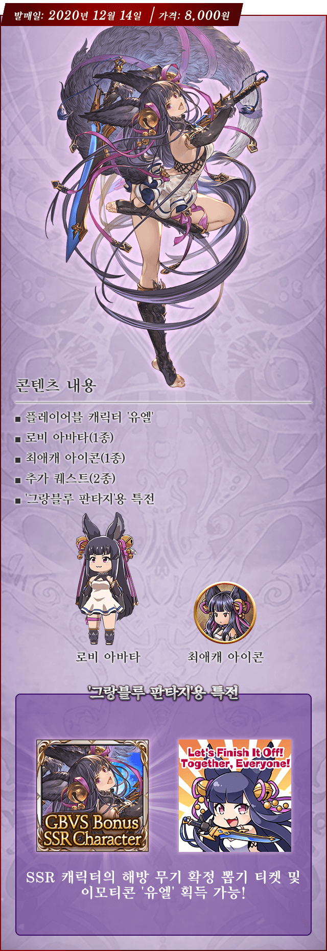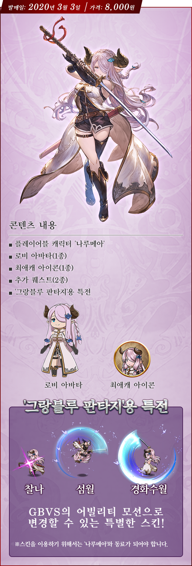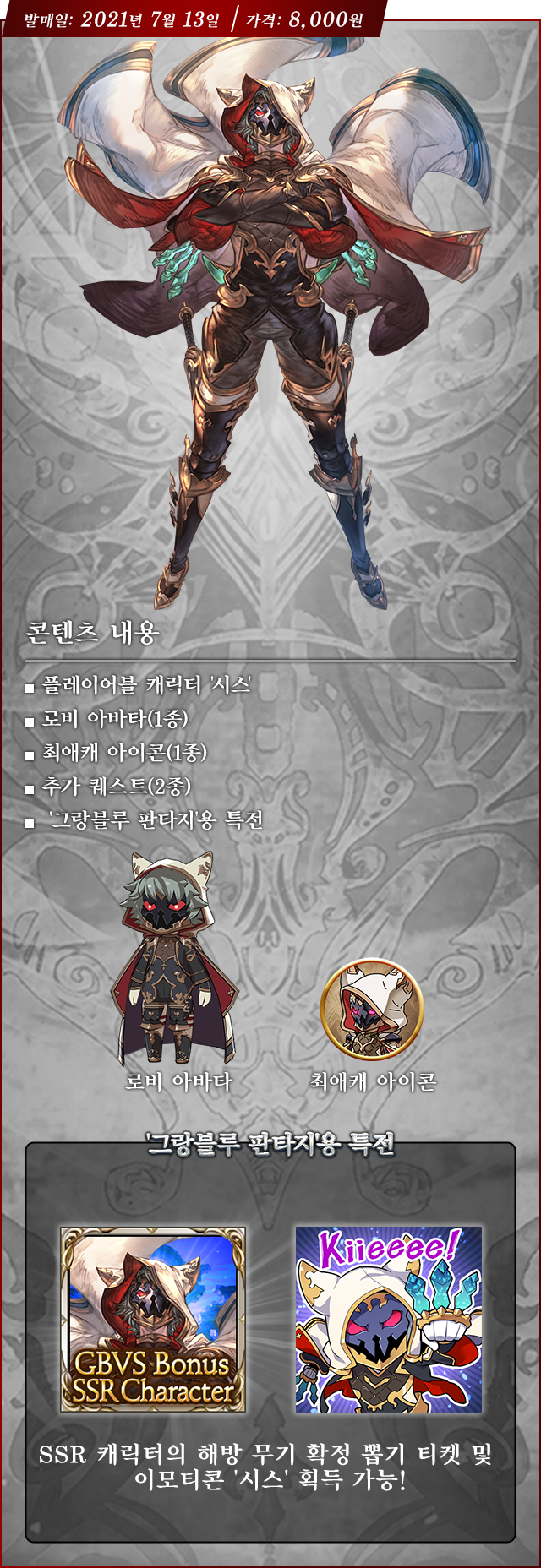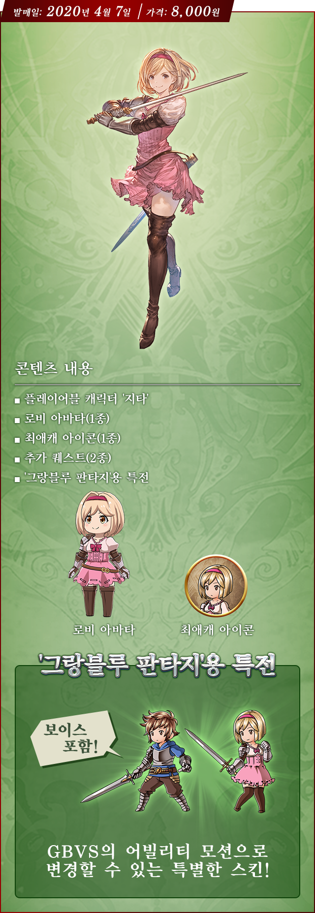 - 시즌 2의 추가 캐릭터가 세트로 된 'GBVS 캐릭터 패스 2'도 판매하고 있습니다. 중복 구매가 되지 않도록 주의하여 주십시오.
